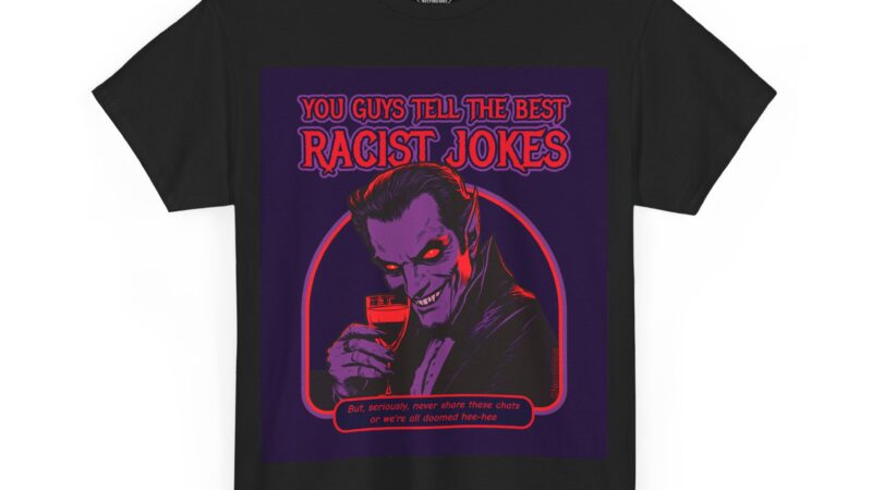 This tee exudes a dark & edgy edge, perfect for those with a gothic style. It’s ideal for fans of vampire culture, racists & meme enthusiasts. This unisex tee can be worn casually or dressed up for a unique & bold look. Suitable for Halloween, goth-themed events, & alternative fashion lovers. GPSR information: … Continue reading Necrolicious “You Guys Tell The Best Racist Jokes” Funny Vampire Goth Meme 100% Cotton Unisex Tee